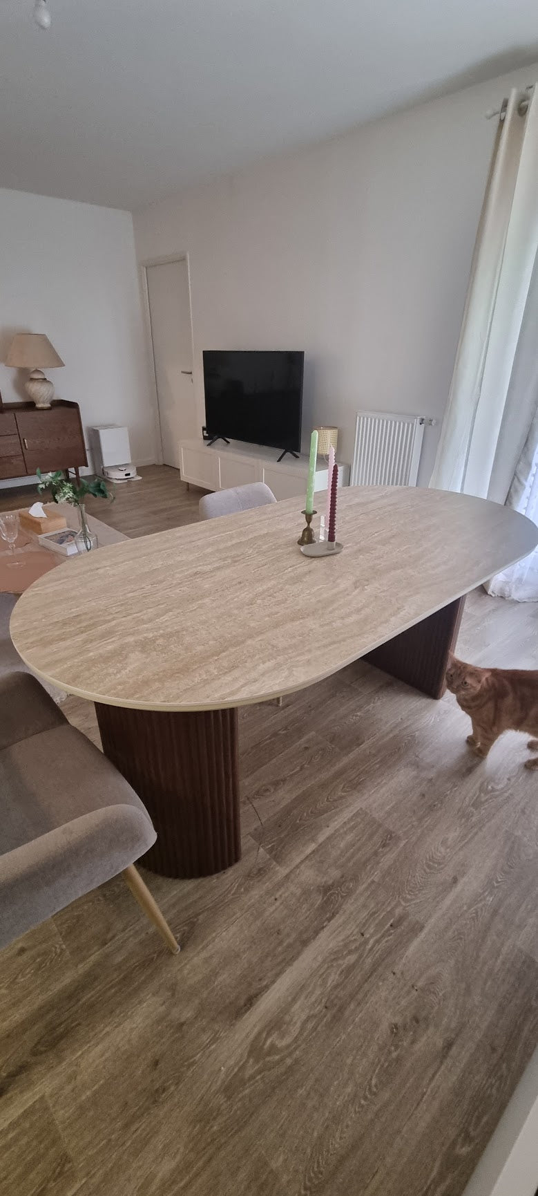Idéale pour une salle à manger contemporaine, elle accueille confortablement jusqu’à 6 personnes et s’accorde parfaitement avec des chaises aux tons doux et aux lignes épurées.