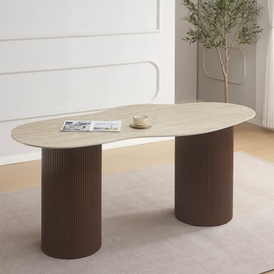 Table à manger en céramique effet travertin – Pied en noyer (180 × 90 × 75 cm)