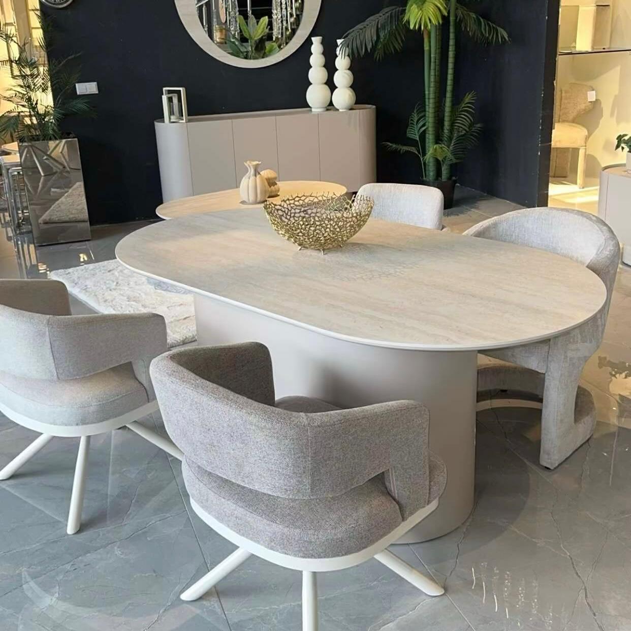 Table à manger en pierre de granite effet travertin – Pied beige