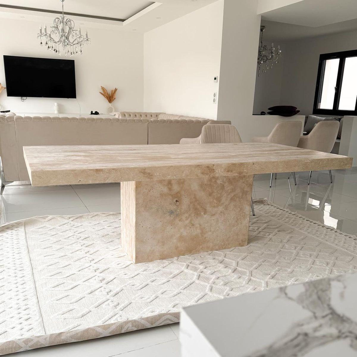 Les tables à manger en travertin sont des pièces lourdes, dont le poids varie entre 100 kg et 150 kg, garantissant une solidité à toute épreuve.